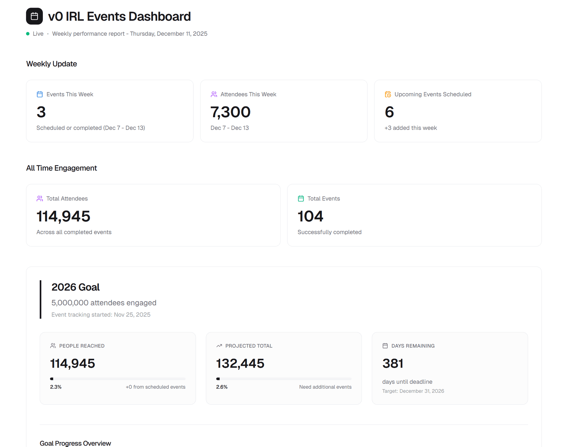 Give me metrics for:- events completed (monthly, yearly, weekly)- attendees engaged (monthly, yearly, weekly)- forward-looking events (scheduled count + weekly additions)
