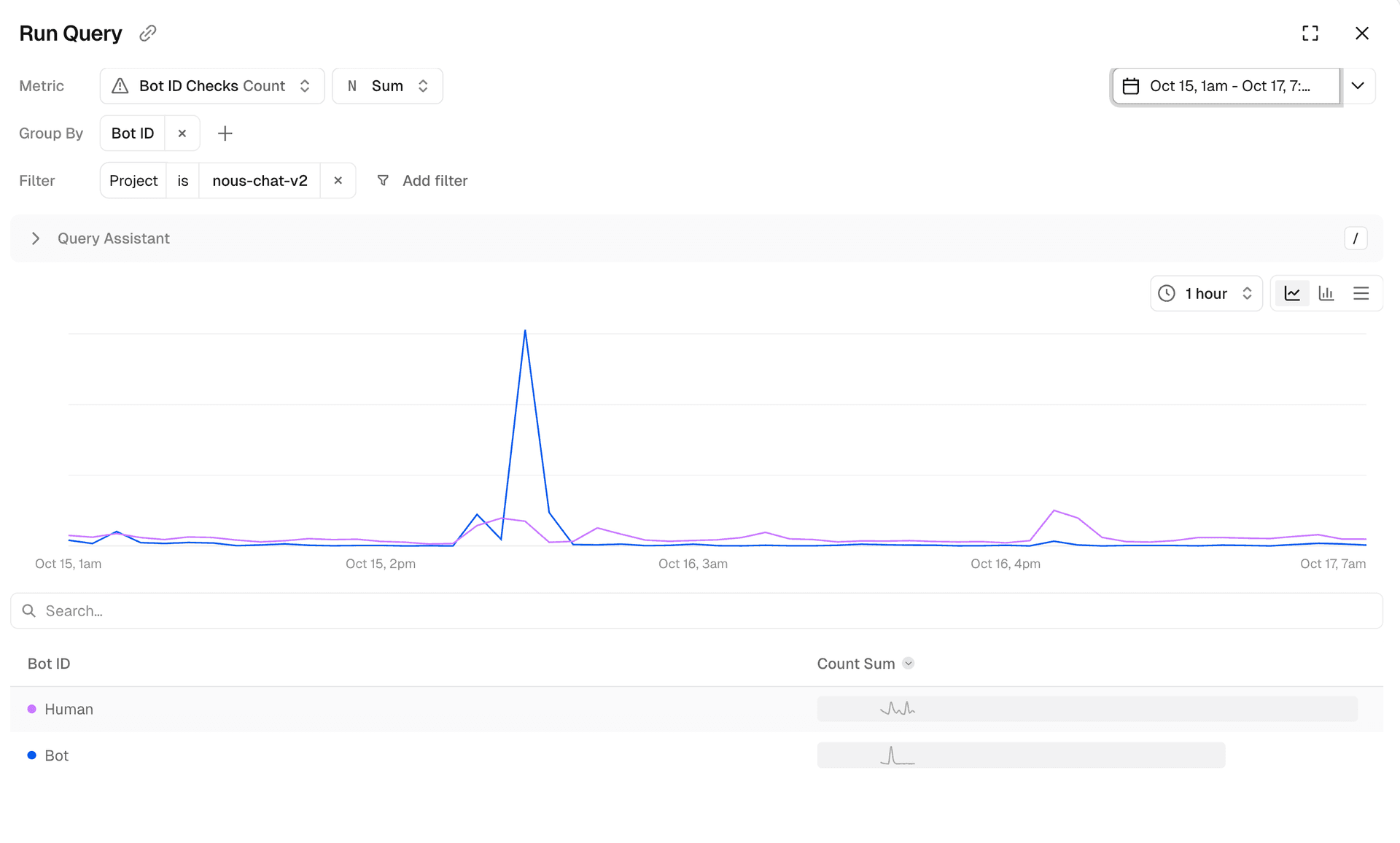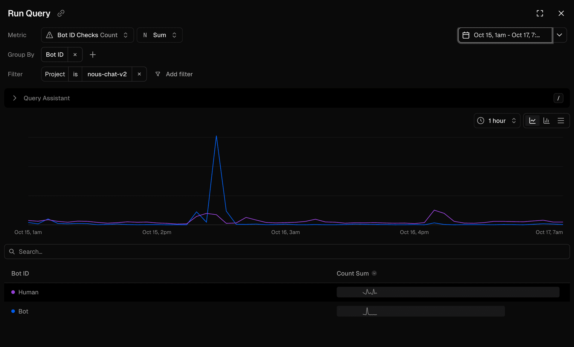 After BotID identified and blocked the traffic, the attack lasted two hours before attackers realized they couldn't perform any inference, and stopped. At its peak, Nous saw a 3,000% increase in traffic volume to its chat app. Despite thousands of attempted sign-ups, inference traffic and availability remained stable.