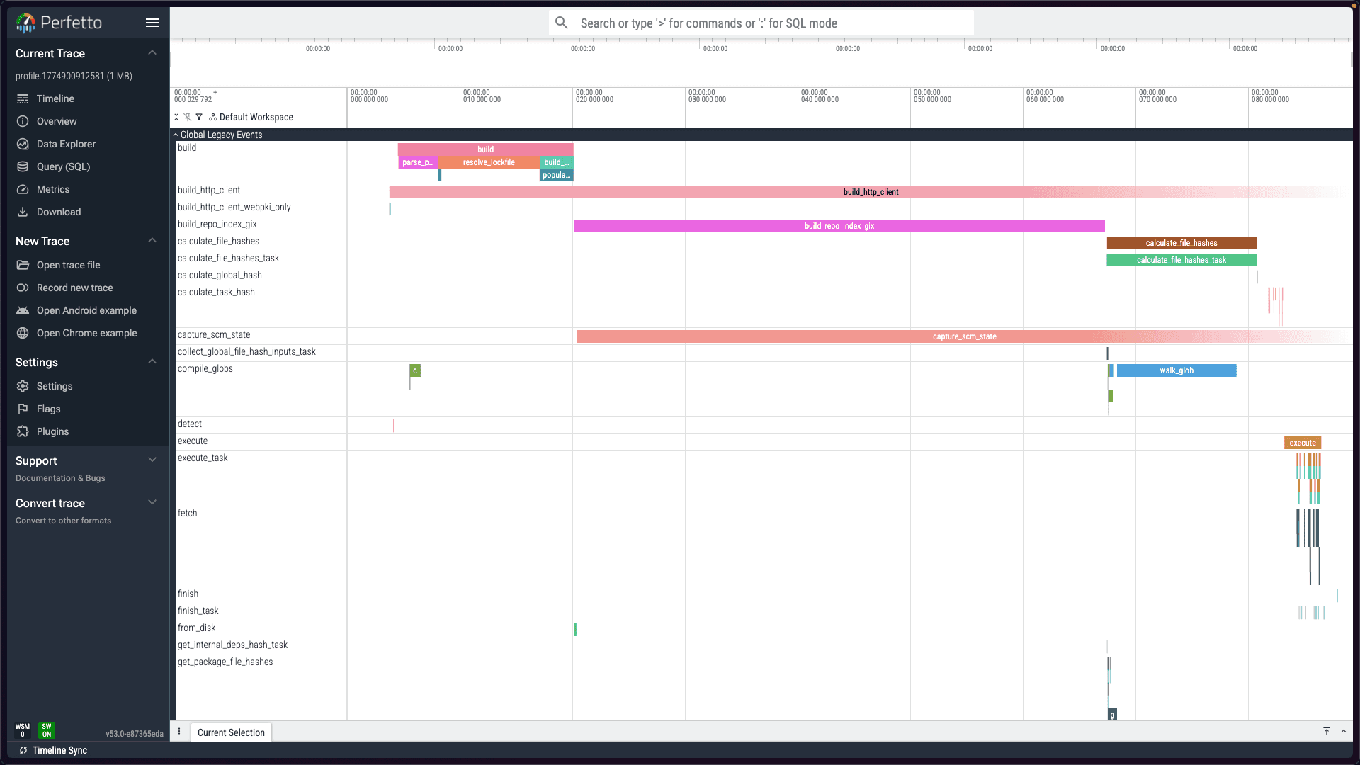 [ {"ph":"M","pid":1,"name":"process_name","args":{"name":"turbo 2.8.21-canary.9"}}, {"ph":"M","pid":1,"name":"process_labels","args":{"labels":"macos, 14 CPUs"}}, {"ph":"M","pid":1,"name":"thread_name","tid":0,"args":{"name":"main"}}, {"ph":"e","pid":1,"ts":8.167,"name":"enable_chrome_tracing","cat":"turborepo_lib::tracing","tid":0,"id":1,".file":"crates/turborepo-lib/src/tracing.rs",".line":325}, {"ph":"b","pid":1,"ts":52.917,"name":"shim_run","cat":"turborepo_lib::shim","tid":0,"id":2251799813685249,".file":"crates/turborepo-lib/src/shim.rs",".line":224}, {"ph":"b","pid":1,"ts":58.959,"name":"run_with_args","cat":"turborepo_shim::run","tid":0,"id":2251799813685249,".file":"crates/turborepo-shim/src/run.rs",".line":189}, {"ph":"i","pid":1,"ts":77.584,"name":"event crates/turborepo-shim/src/run.rs:223","cat":"turborepo_shim::run","tid":0,"s":"t",".file":"crates/turborepo-shim/src/run.rs",".line":223}, {"ph":"b","pid":1,"ts":78.792,"name":"repo_inference","cat":"turborepo_shim::run","tid":0,"id":2251799813685249,".file":"crates/turborepo-shim/src/run.rs",".line":251}, {"ph":"b","pid":1,"ts":88.209,"name":"infer","cat":"turborepo_repository::inference","tid":0,"id":2251799813685249,".file":"crates/turborepo-repository/src/inference.rs",".line":76}, {"ph":"i","pid":1,"ts":130.375,"name":"event crates/turborepo-repository/src/package_json.rs:166","cat":"turborepo_repository::package_json","tid":0,"s":"t",".file":"crates/turborepo-repository/src/package_json.rs",".line":166}, {"ph":"b","pid":1,"ts":456.709,"name":"parse","cat":"biome_json_parser","tid":0,"id":2251799813685249,".file":"/Users/runner/.cargo/registry/src/index.crates.io-1949cf8c6b5b557f/biome_json_parser-0.5.7/src/lib.rs",".line":32}, {"ph":"e","pid":1,"ts":546.042,"name":"parse","cat":"biome_json_parser","tid":0,"id":2251799813685249,".file":"/Users/runner/.cargo/registry/src/index.crates.io-1949cf8c6b5b557f/biome_json_parser-0.5.7/src/lib.rs",".line":32}, {"ph":"i","pid":1,"ts":5418.584,"name":"event crates/turborepo-repository/src/package_json.rs:166","cat":"turborepo_repository::package_json","tid":0,"s":"t",".file":"crates/turborepo-repository/src/package_json.rs",".line":166}, // Many more lines of JSON...]An abbreviated Chrome Tracing profile created by Turborepo