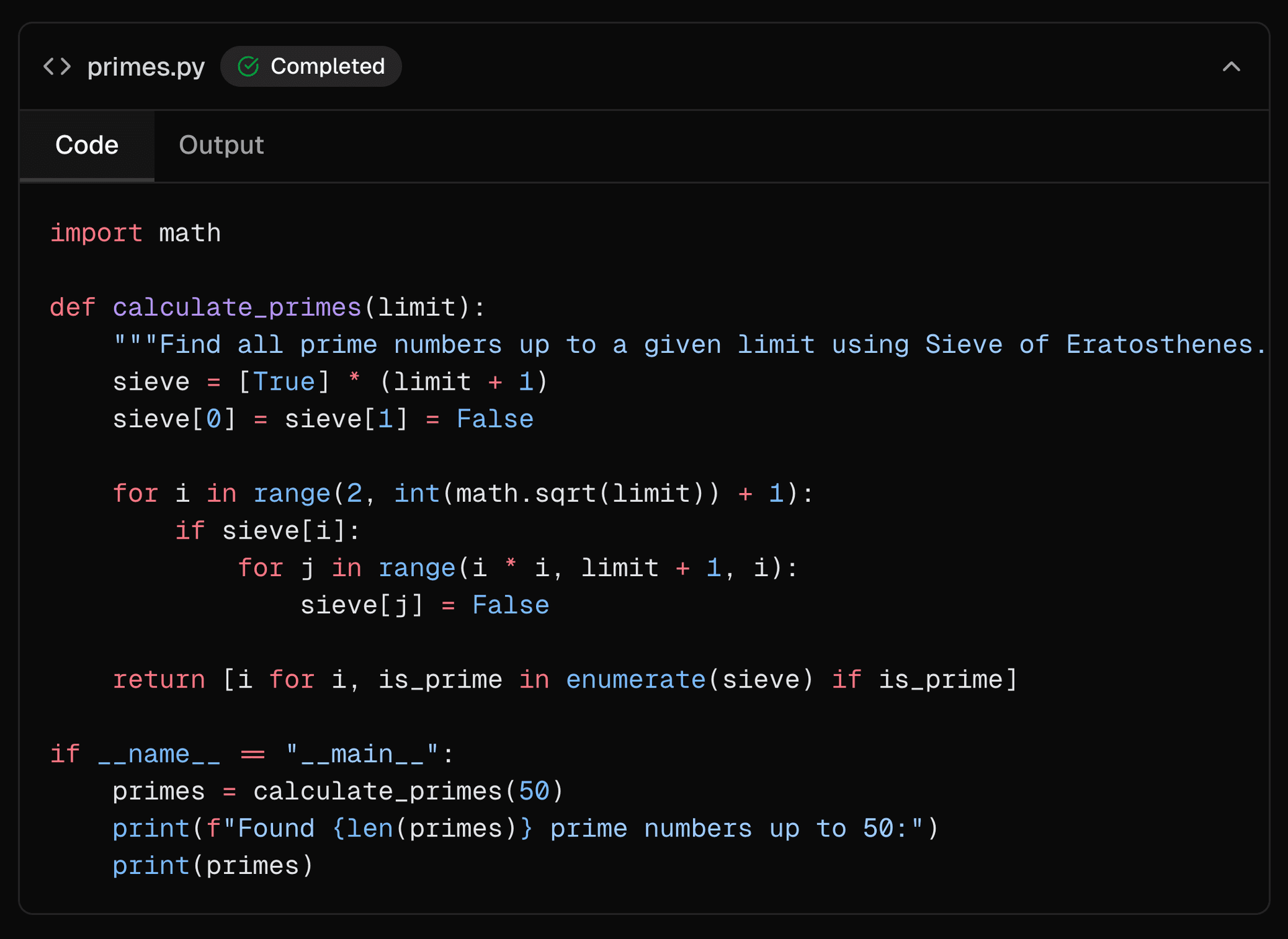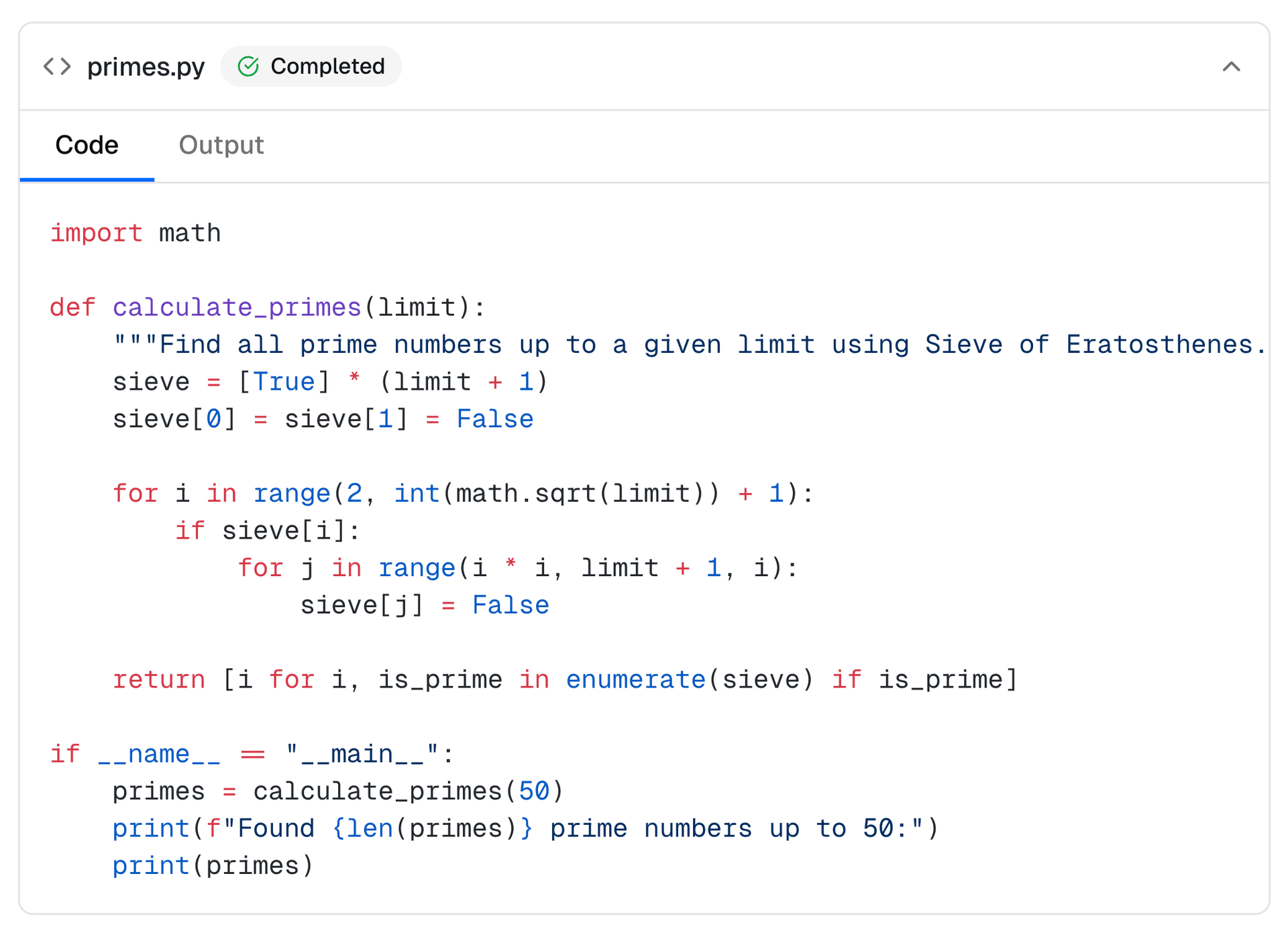 The Sandbox component provides a structured way to display AI-generated code alongside its execution output in chat conversations. It features a collapsible container with status indicators and tabbed navigation between code and output views.