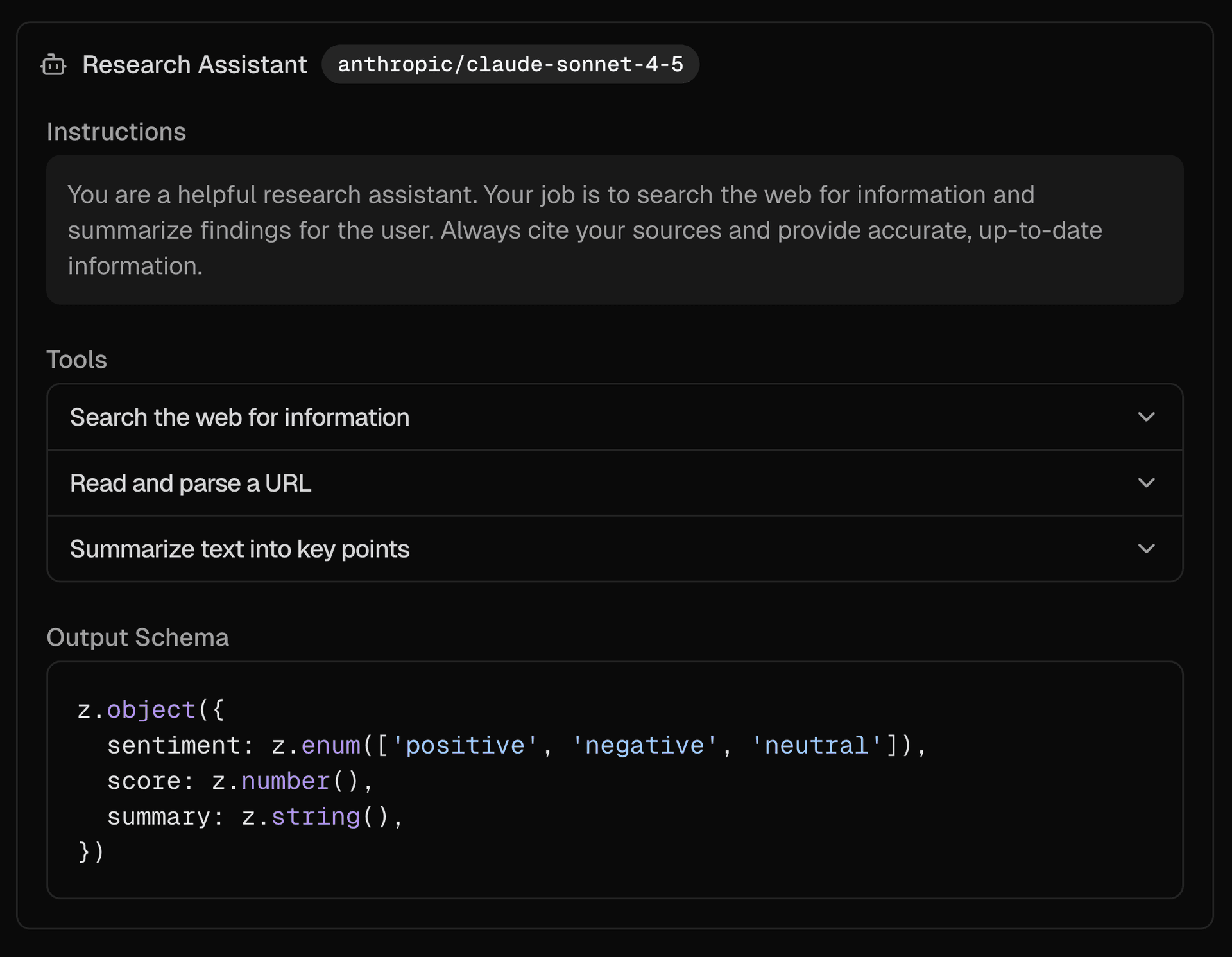 A composable component for displaying an AI SDK ToolLoopAgent configuration with model, instructions, tools, and output schema.