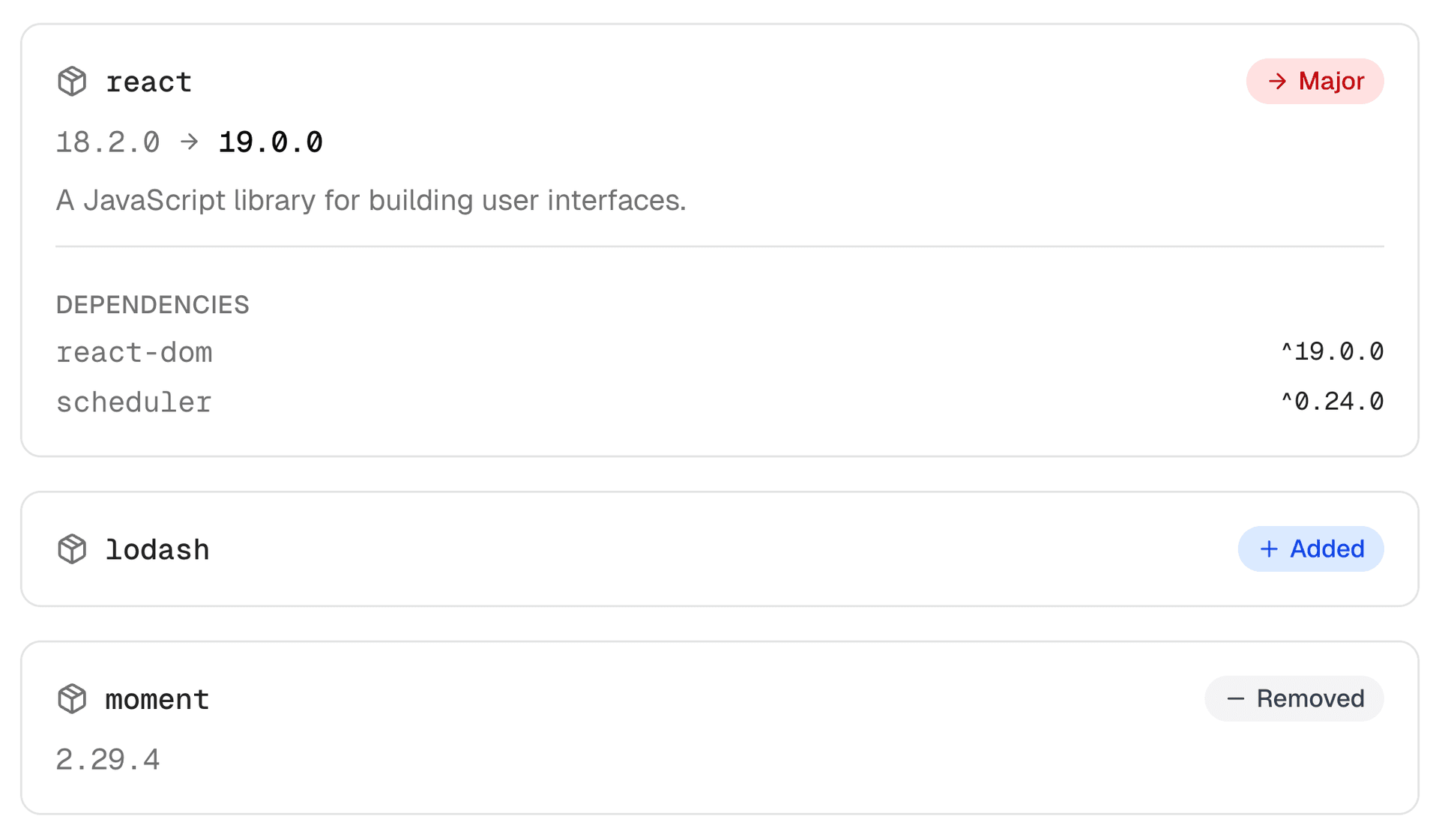 The PackageInfo component displays package dependency information including version changes and change type badges.