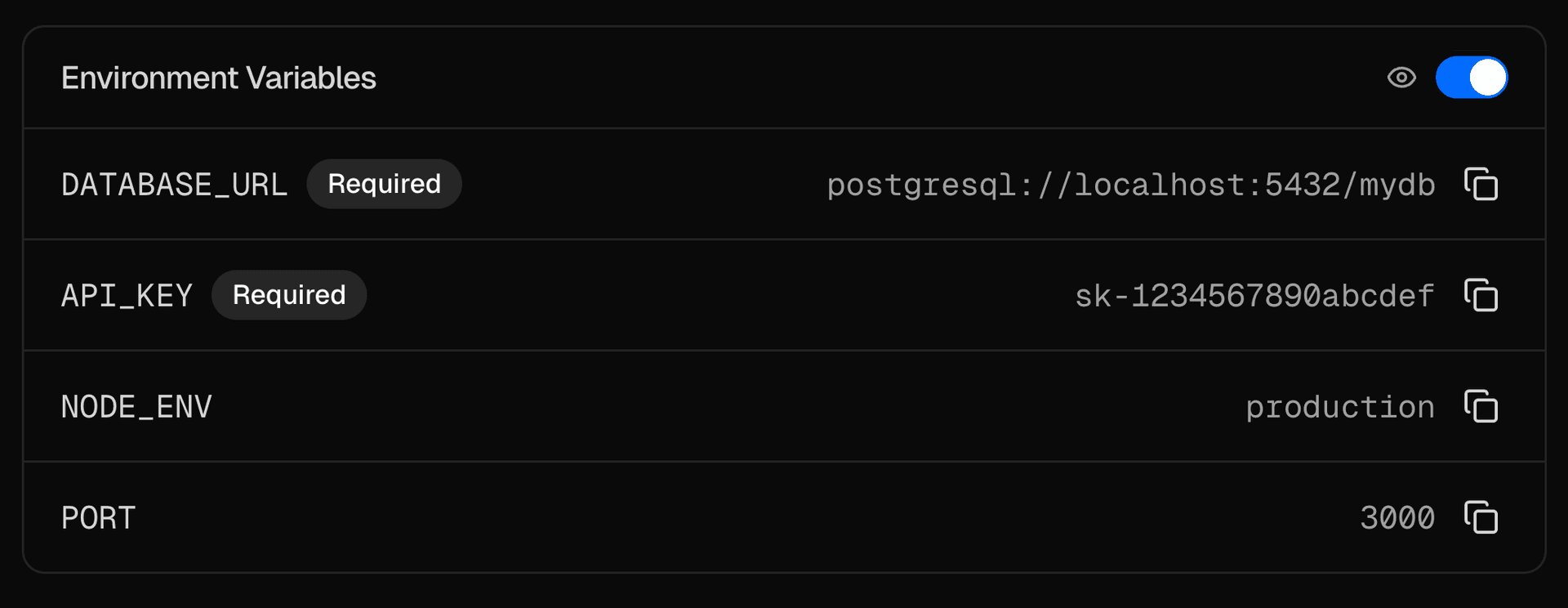 The EnvironmentVariables component displays environment variables with value masking, visibility toggle, and copy functionality.