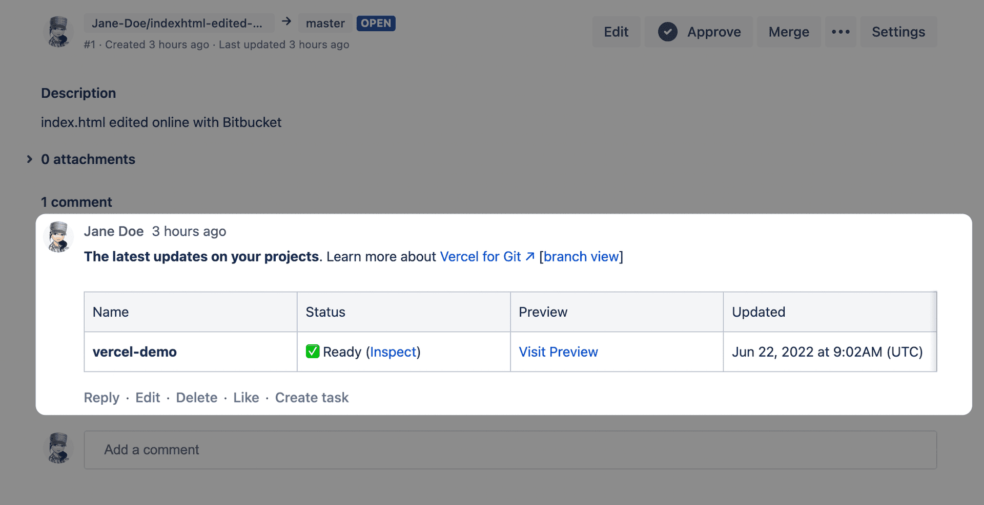 Vercel for Bitbucket automatically deploys your Bitbucket projects with Vercel, providing Preview Deployment URLs, and automatic Custom Domain updates.