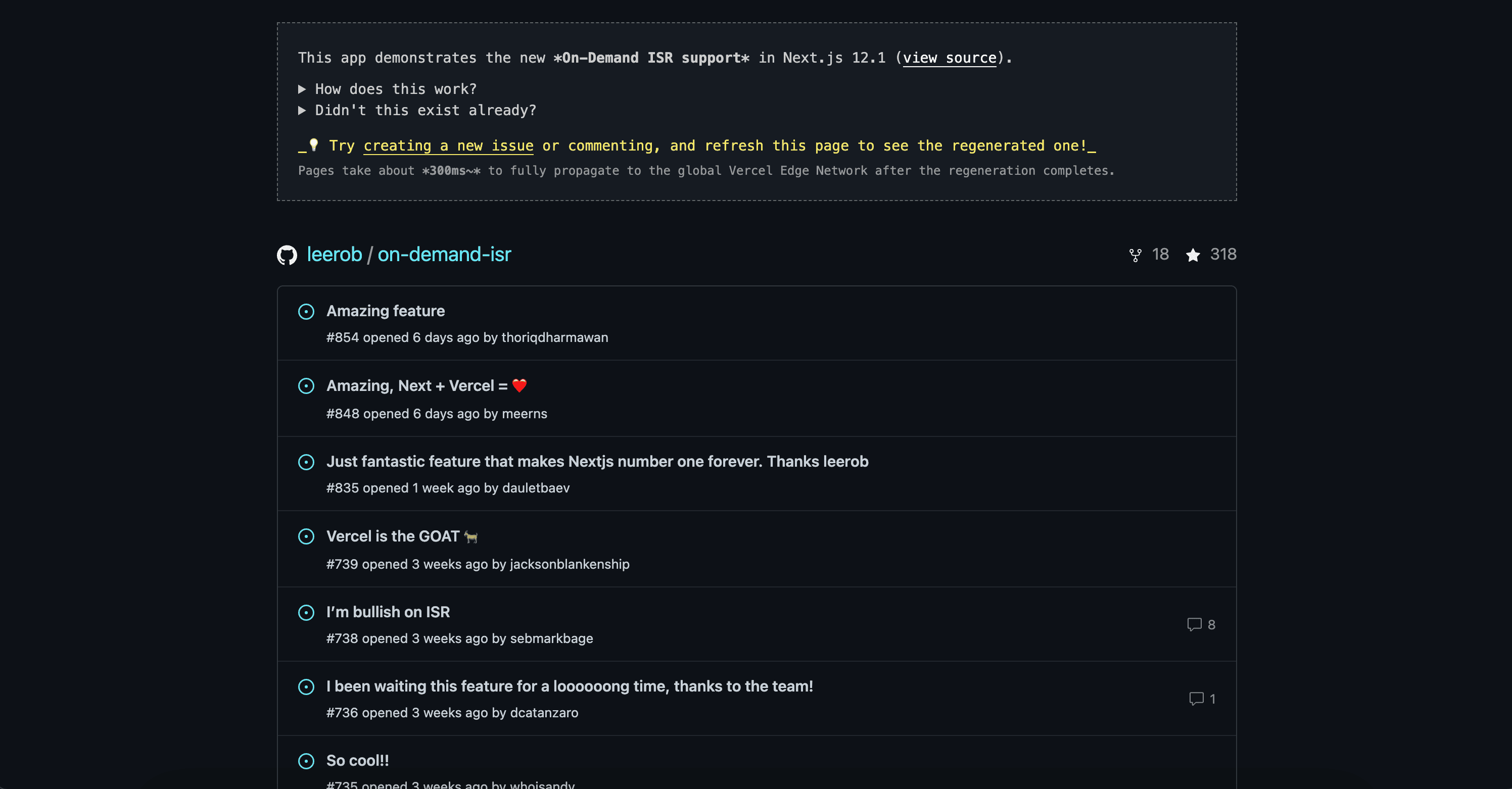 Demo of On-demand ISR in Next.js using GitHub Issues. When a new issue is created, a webhook from a GitHub App pushes new changes to the deployed application to regenerate the static page.